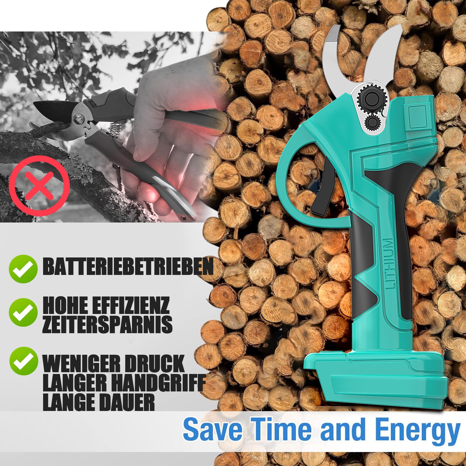 Schluss mit anstrengendem Gartenscheren! Diese elektrische Gartenschere läuft mit deiner vorhandenen Makita-Akku-Batterie (kompatibel mit BL1815, BL1820, BL1830B, BL1840B u.v.m. – Batterie nicht im Lieferumfang). Mit einem leistungsstarken bürstenlosen Motor und einer scharfen SK5-Karbonstahl-Klinge schneidet sie Äste bis 30 mm Durchmesser mühelos und sauber ab. Ergonomisches Design, leicht, mit Sicherheitsschloss (zweifacher Druck zum Aktivieren) und automatischer Abschaltung nach 30 Sekunden Inaktivität. Perfekt für Obstbäume, Reben, Sträucher, aber auch zum Schneiden von Seilen oder Kunststoffrohren. Ideal für Gärtner, Winzer oder Hobbygärtner, die Wert auf Effizienz und Komfort legen. Einfach Akku einsetzen, einschalten und schneiden – deine Hände und dein Rücken danken es dir!